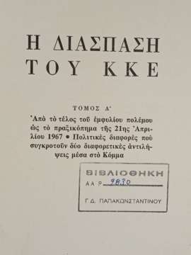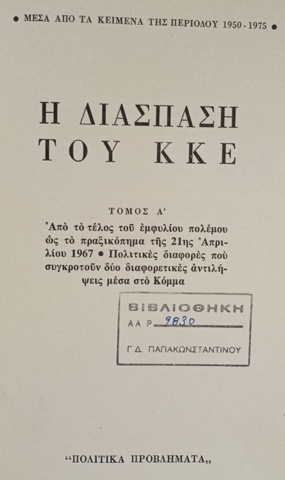 Η ΔΙΑΣΠΑΣΗ ΤΟΥ ΚΚΕ ΜΕΣΑ ΑΠΟ ΤΑ ΚΕΙΜΕΝΑ ΤΗΣ ΠΕΡΙΟΔΟΥ 1950-1975 - ΔΙΤΟΜΟ